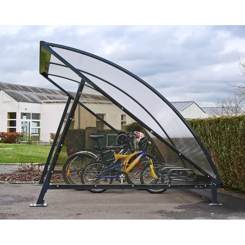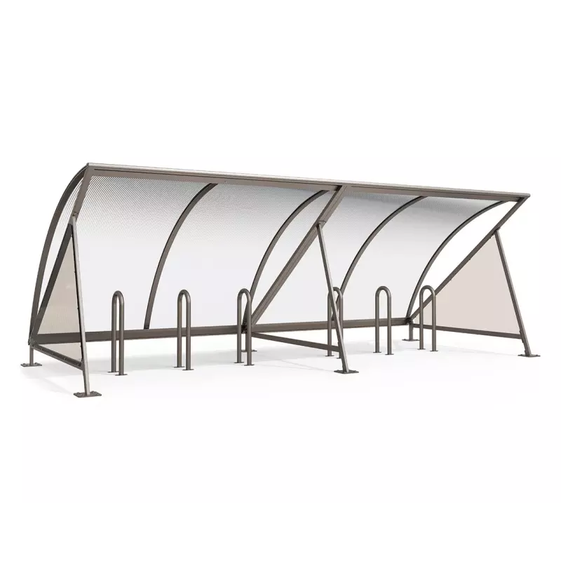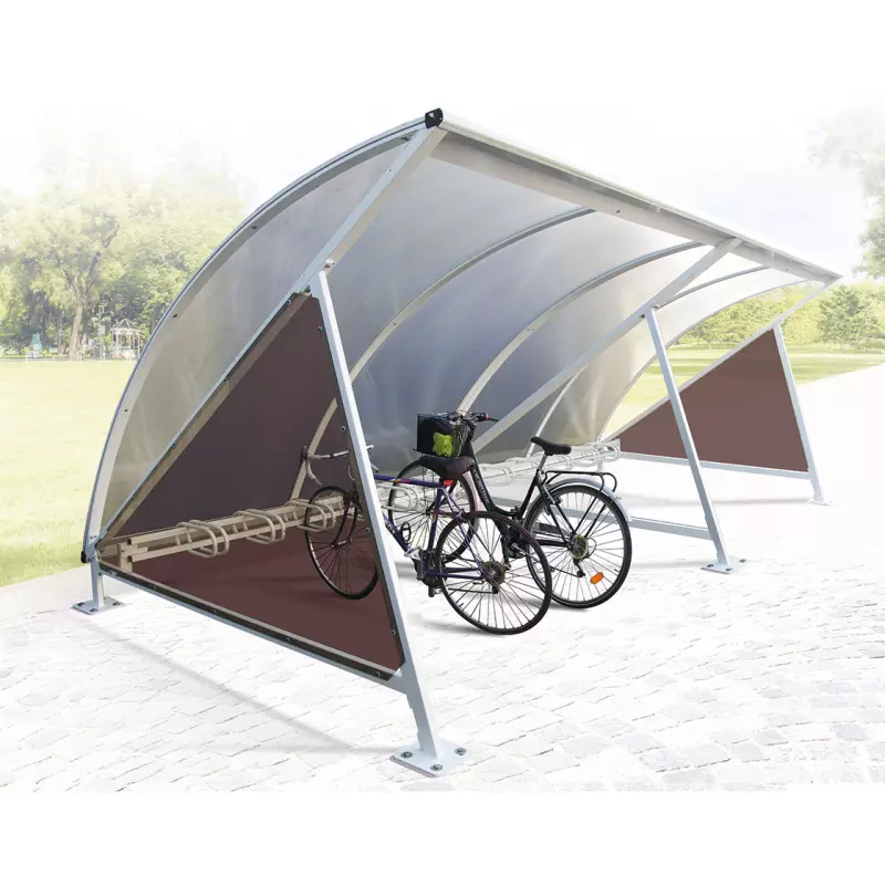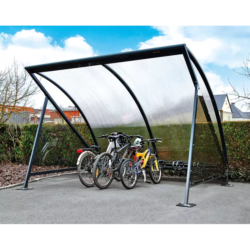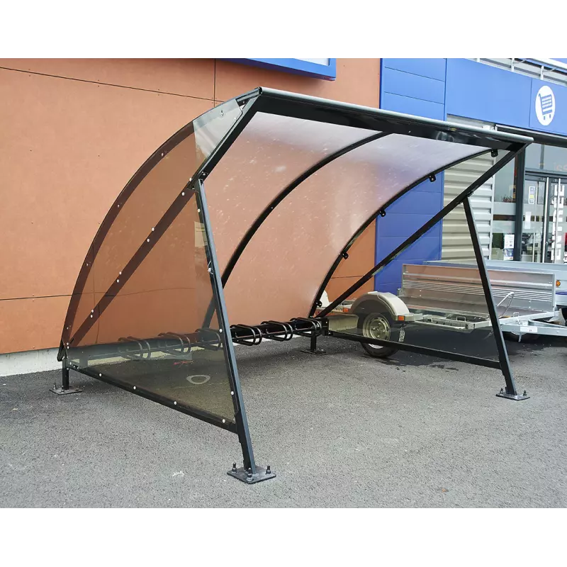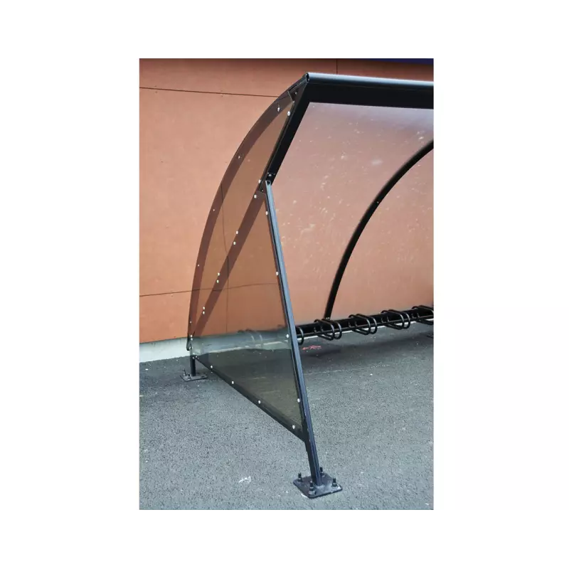 El techo de bóveda en policarbonato alveolar de 6 mm con tratamiento anti-UV aporta claridad, ligereza visual y protección duradera contra la radiación solar. El canalón de aluminio integrado permite evacuar el agua de lluvia sin que caiga sobre los usuarios o las bicicletas.