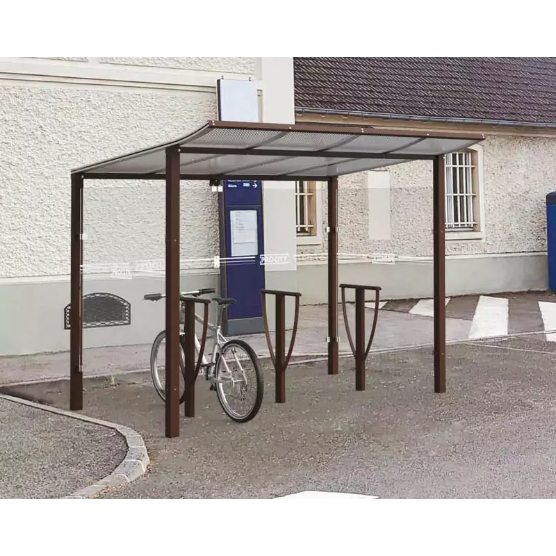 El Aparcabicis Cubierto Zuera combina funcionalidad, diseño y seguridad en una solución elegante para el estacionamiento de bicicletas. Con acabados simples pero cuidados, este refugio ofrece un aspecto dinámico gracias a su techo ligeramente curvado y travesaños de aluminio anodizado, integrándose perfectamente en entornos urbanos modernos.