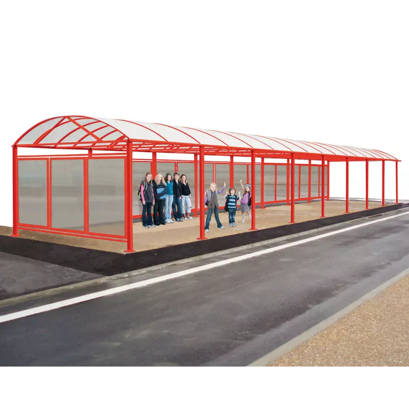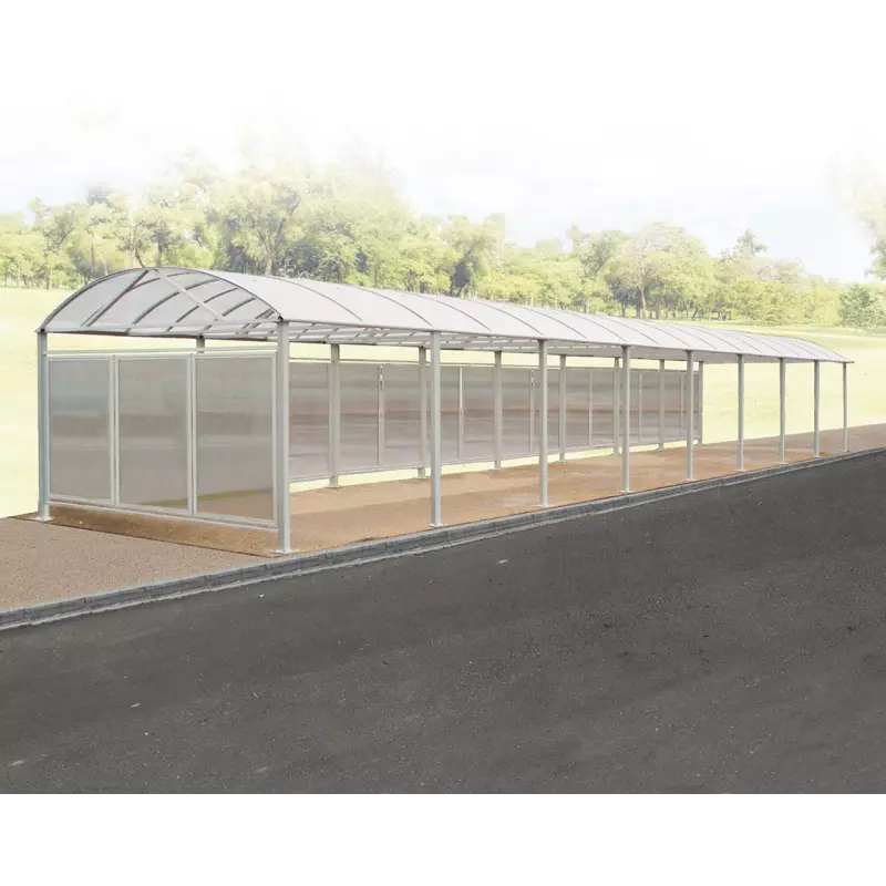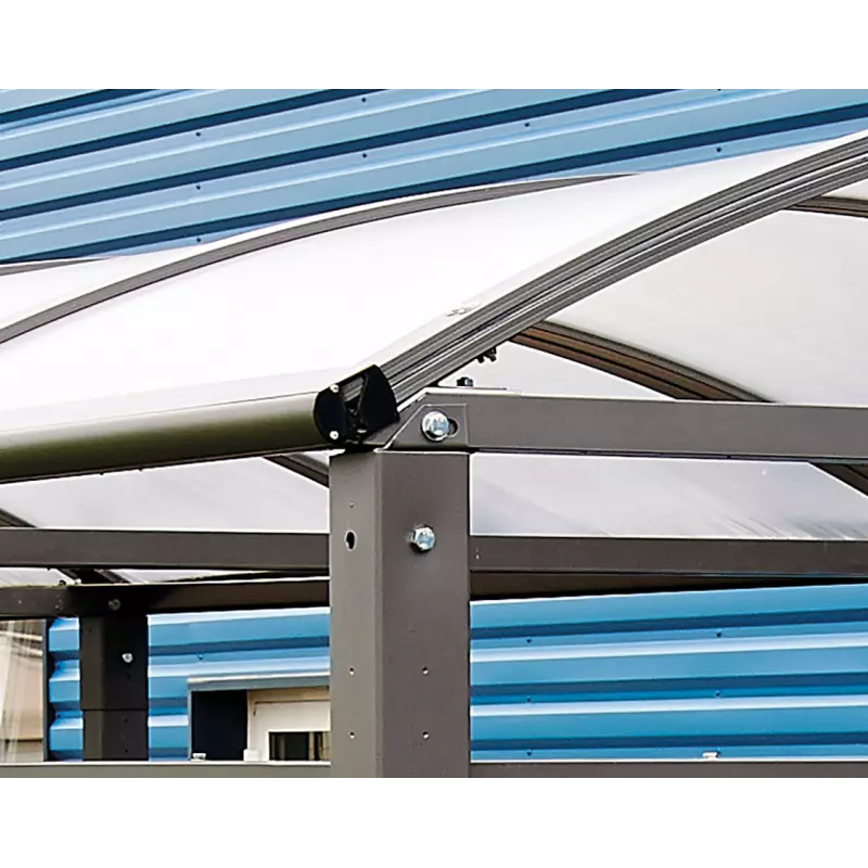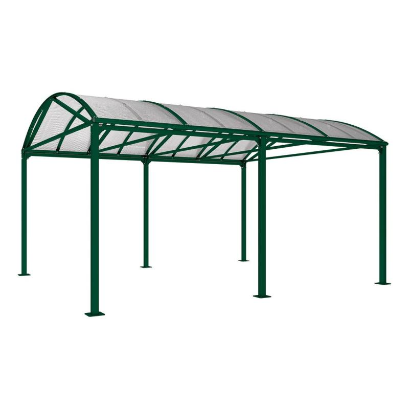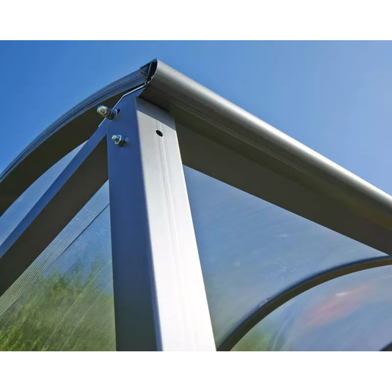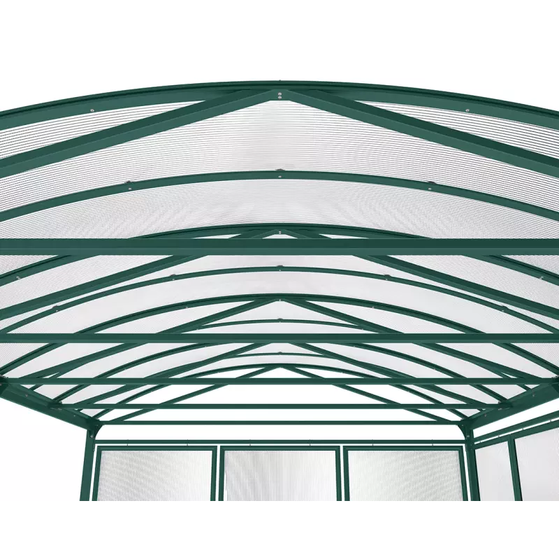 Travesaños acero 60 x 40 mm, canalones aluminio 50 x 30 mm, bóveda policarbonato alveolar 6 mm anti-UV