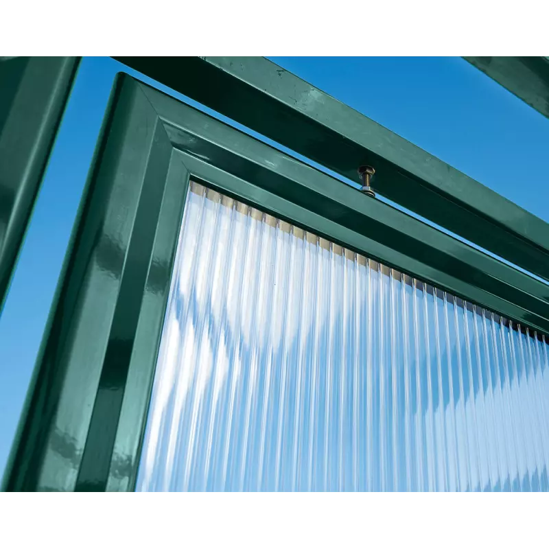 Travesaños 40 x 60 mm, canalones aluminio-acero 50 x 30 mm, bóveda policarbonato alveolar 6 mm anti-UV
