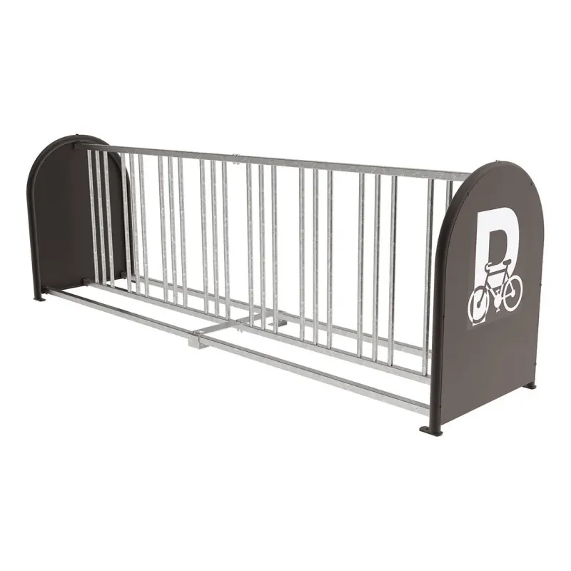 Aparcabicis de suelo con capacidad para 16 bicicletas y señalización integrada